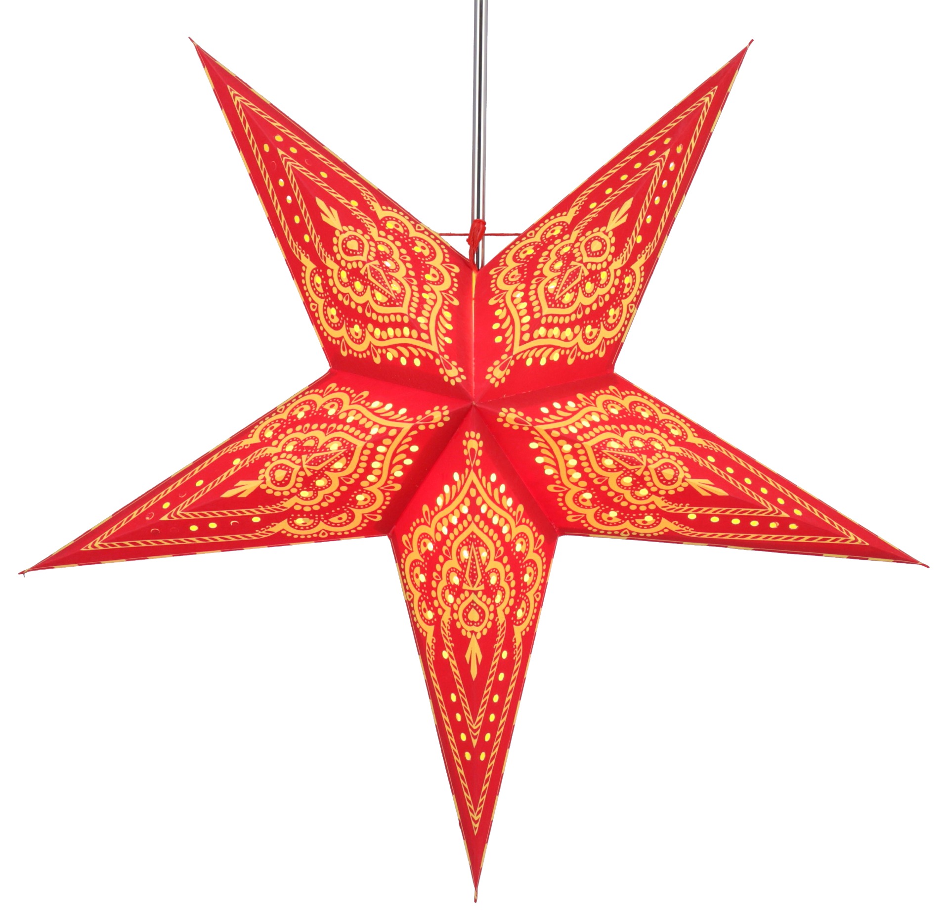 Smuk papirstjerne i rød og gul. Måler 60cm i dia. Til indendørsbrug. Samleinstruktion medfølger. Kan bruges med og uden lys.